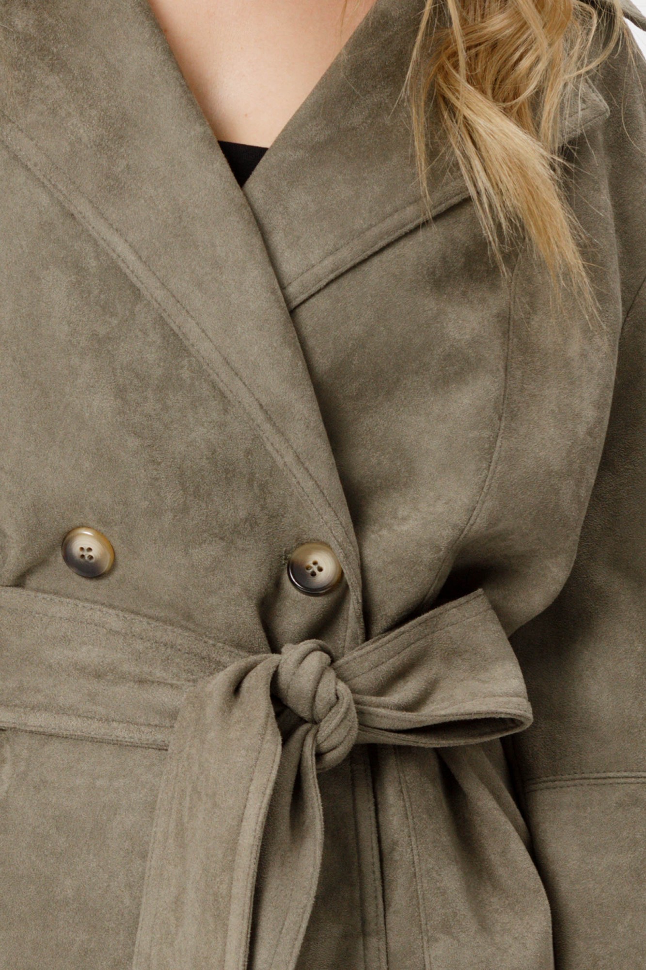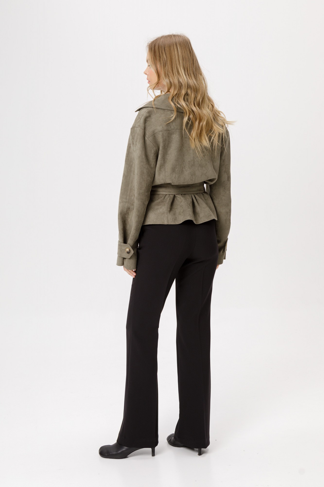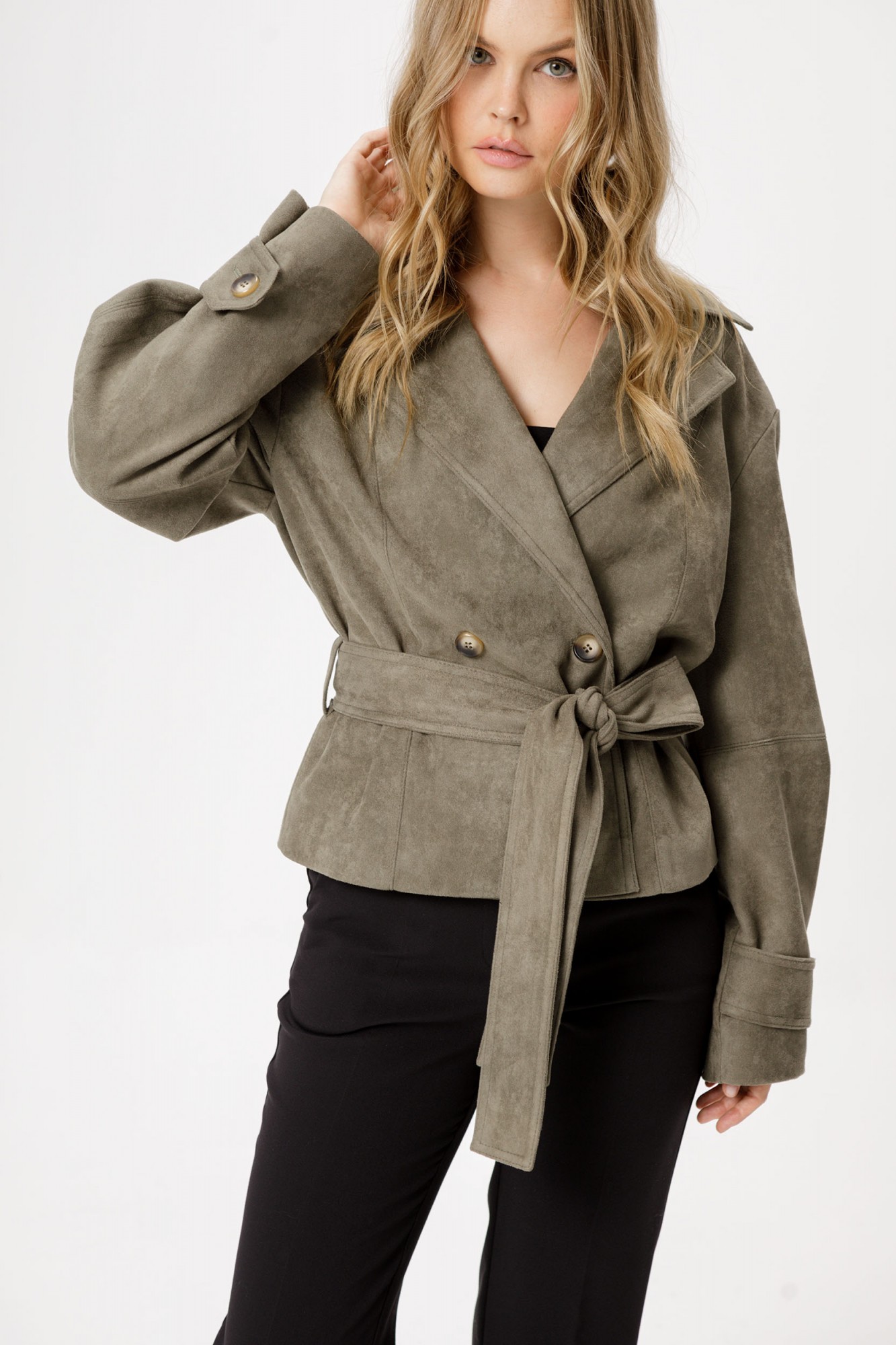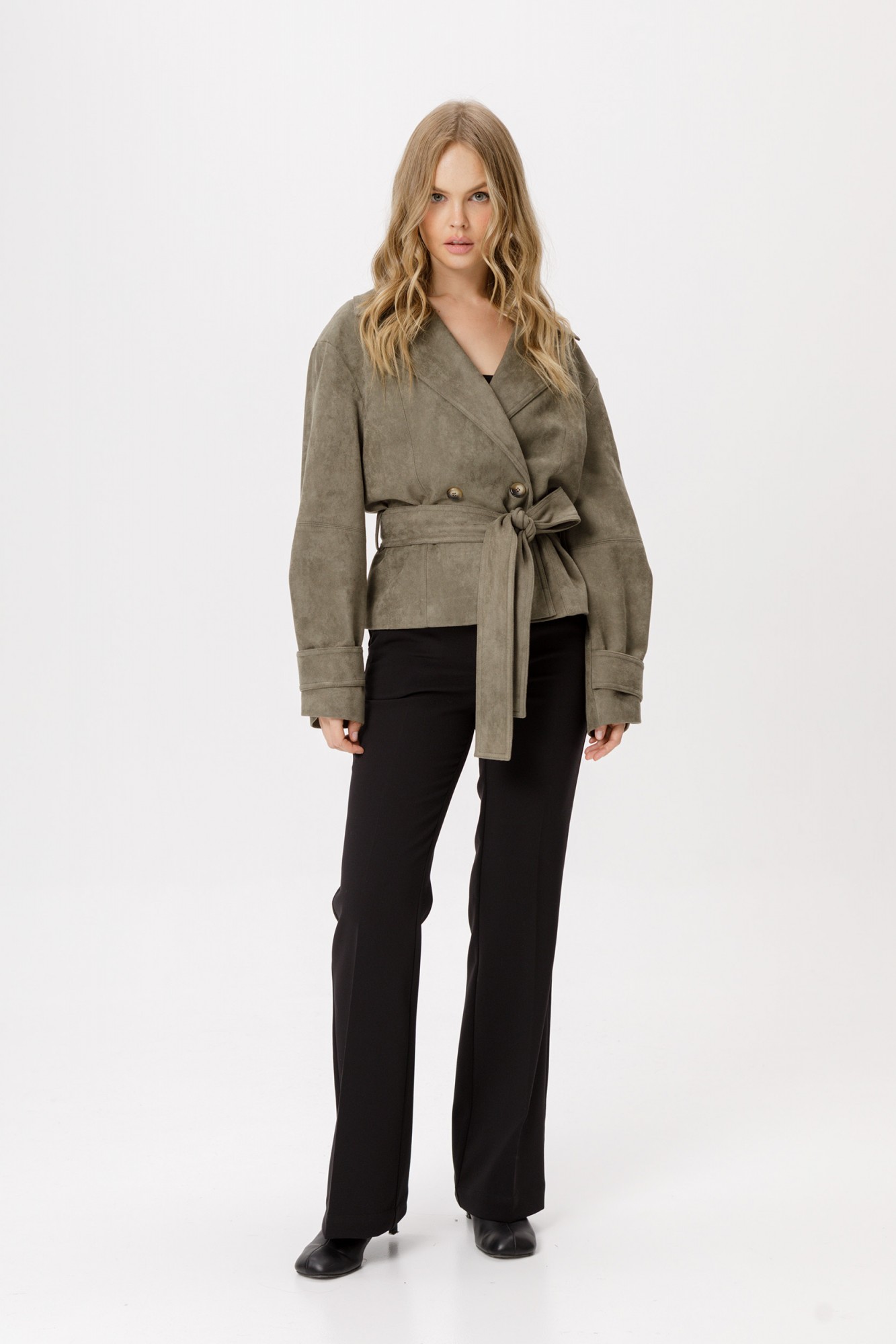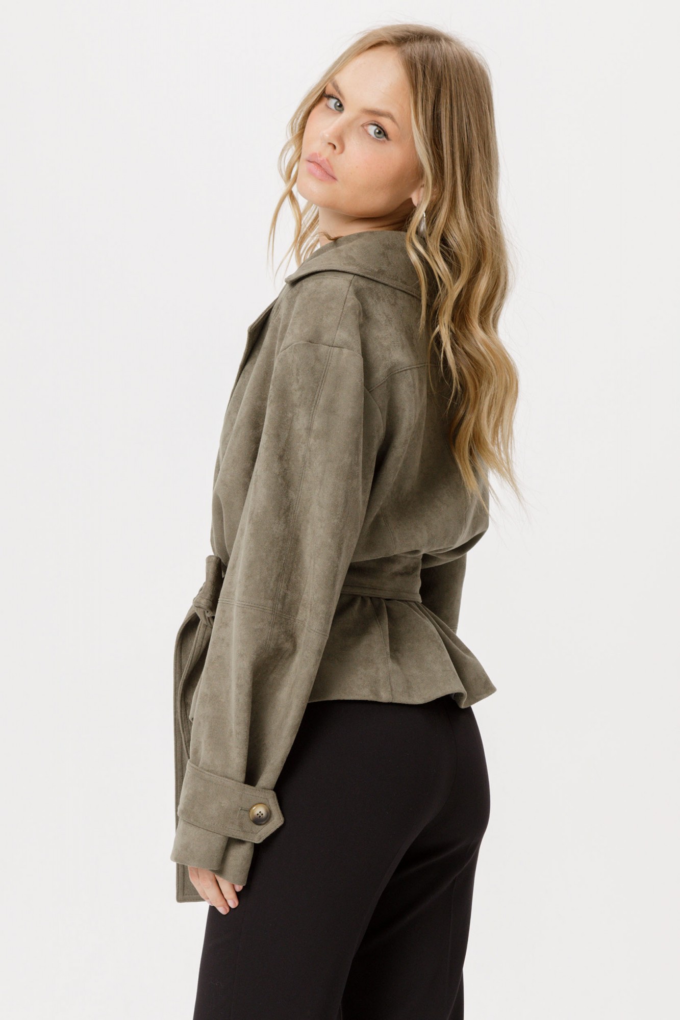 Замшевый укороченный жакет с поясом. Детали: прямой силуэт, спущенные плечи, пиджачный воротник, рельефные швы по переду и спинке, кокетка спинки, рукава втачные, смещённая застёжка на петлю и пуговицу, съемный пояс, жакет на подкладке.