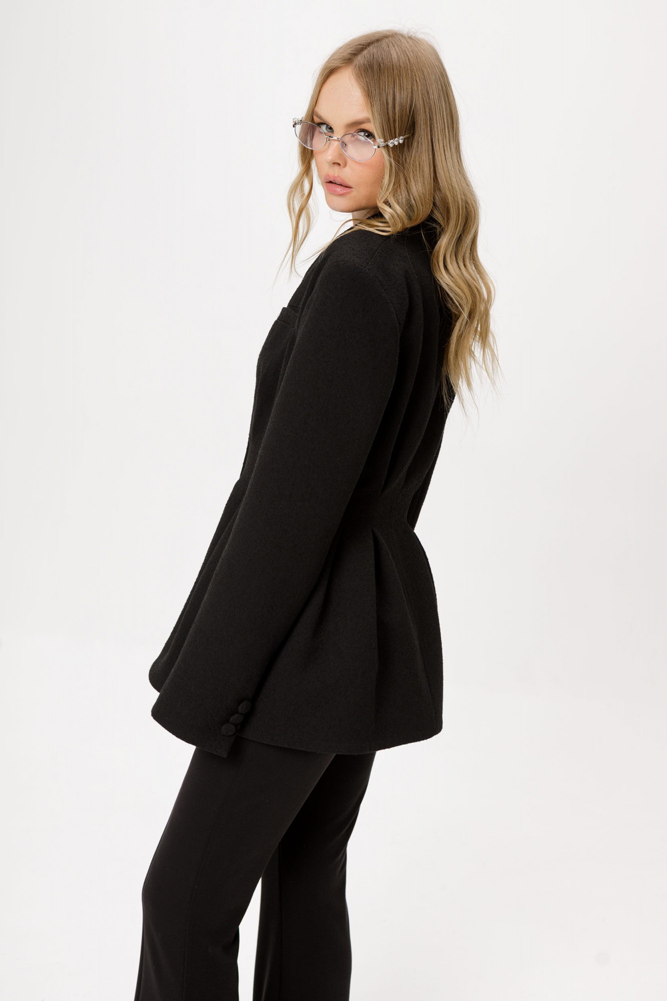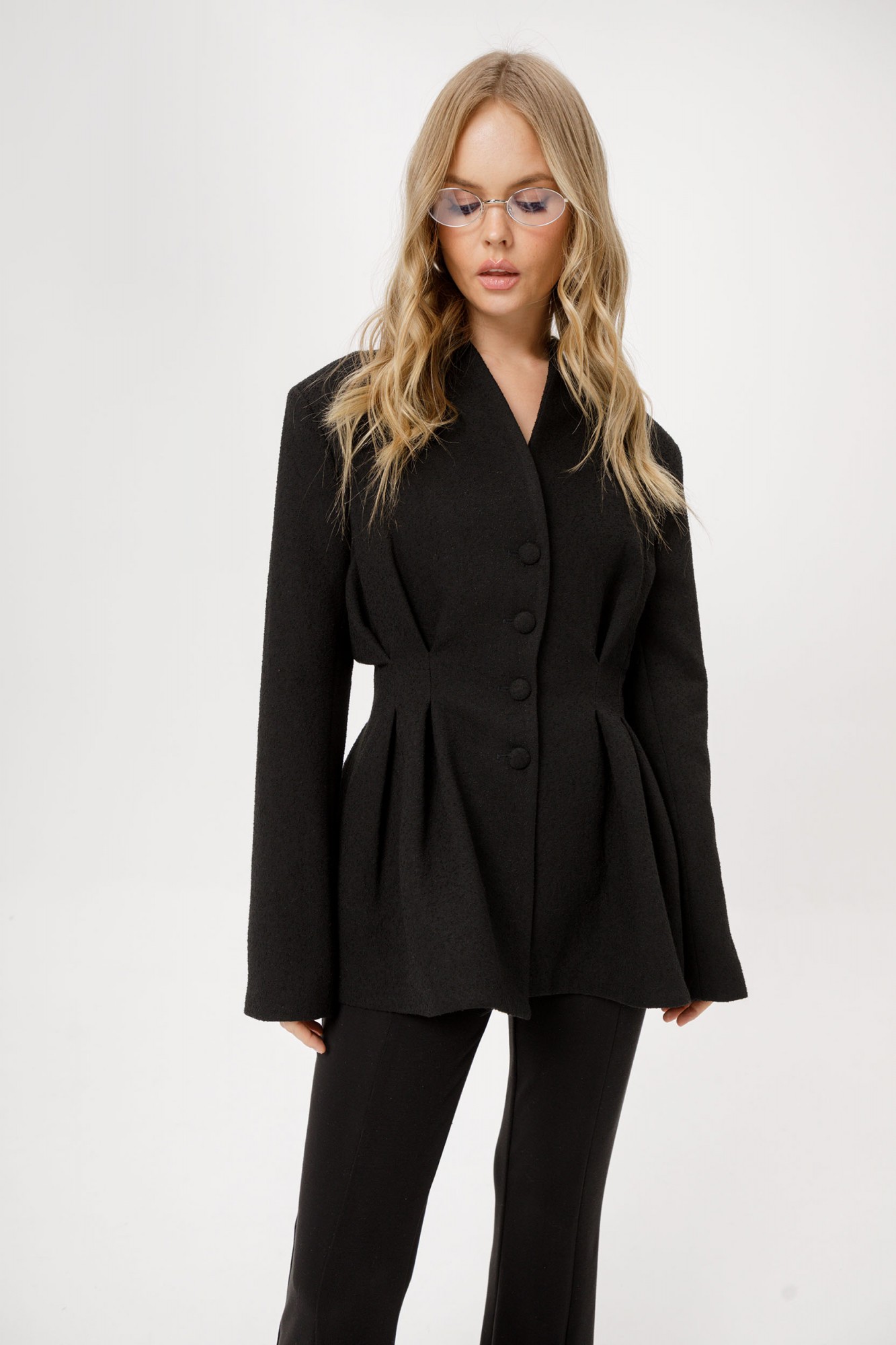 Приталенный жакет со складками и расширенными плечами из фактурной ткани «букле». Детали: полуприлегающий силуэт с расширенными плечами, цельнокроеный воротник-стойка, застежка на петли и пуговицы, рукава втачные двухшовные, жакет на подкладке.