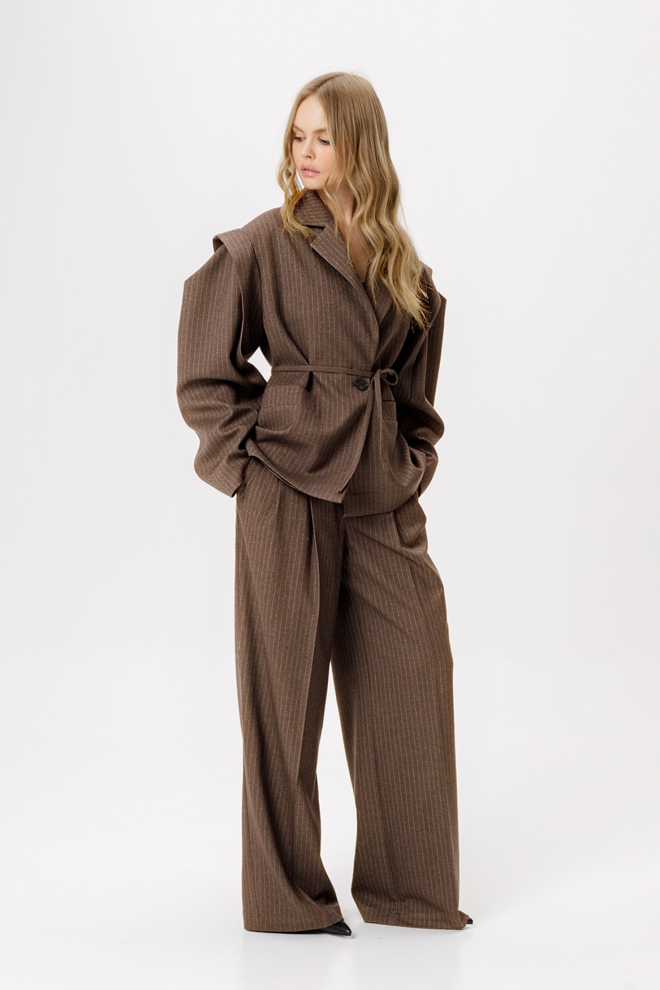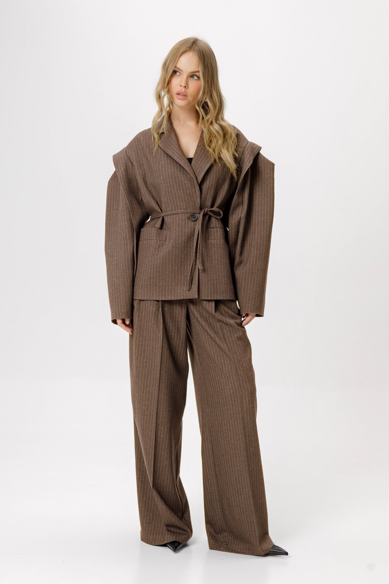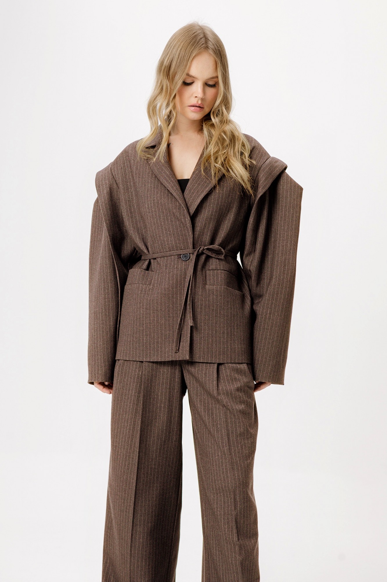 Оверсайз жакет со съёмным поясом. Детали: прямой силуэт, удлинённая линия плеча, втачной одношовный рукав с ассиметричными складками, функциональные карманы, центральная застёжка на 1 пуговицу, жакет на подкладке.