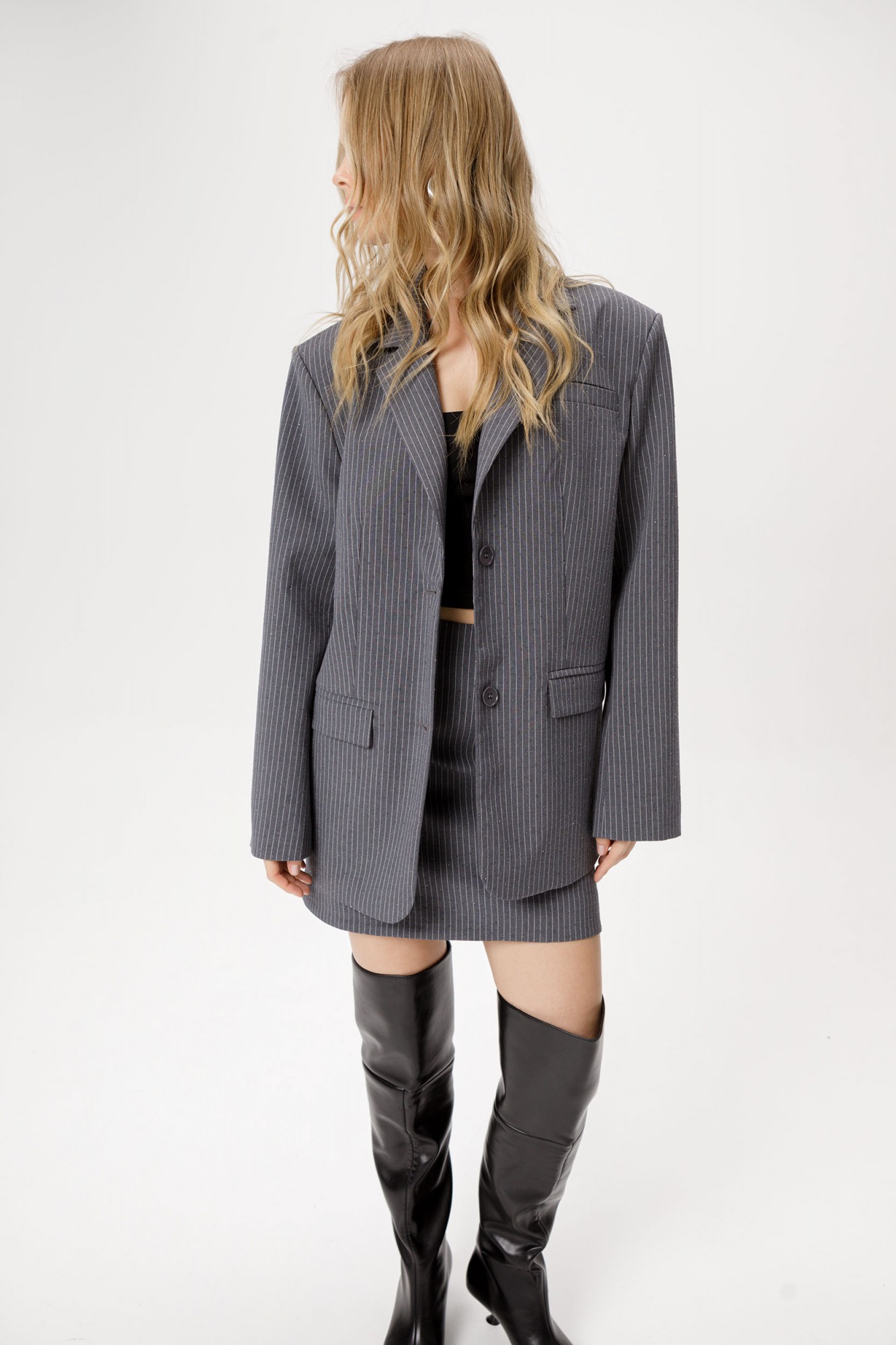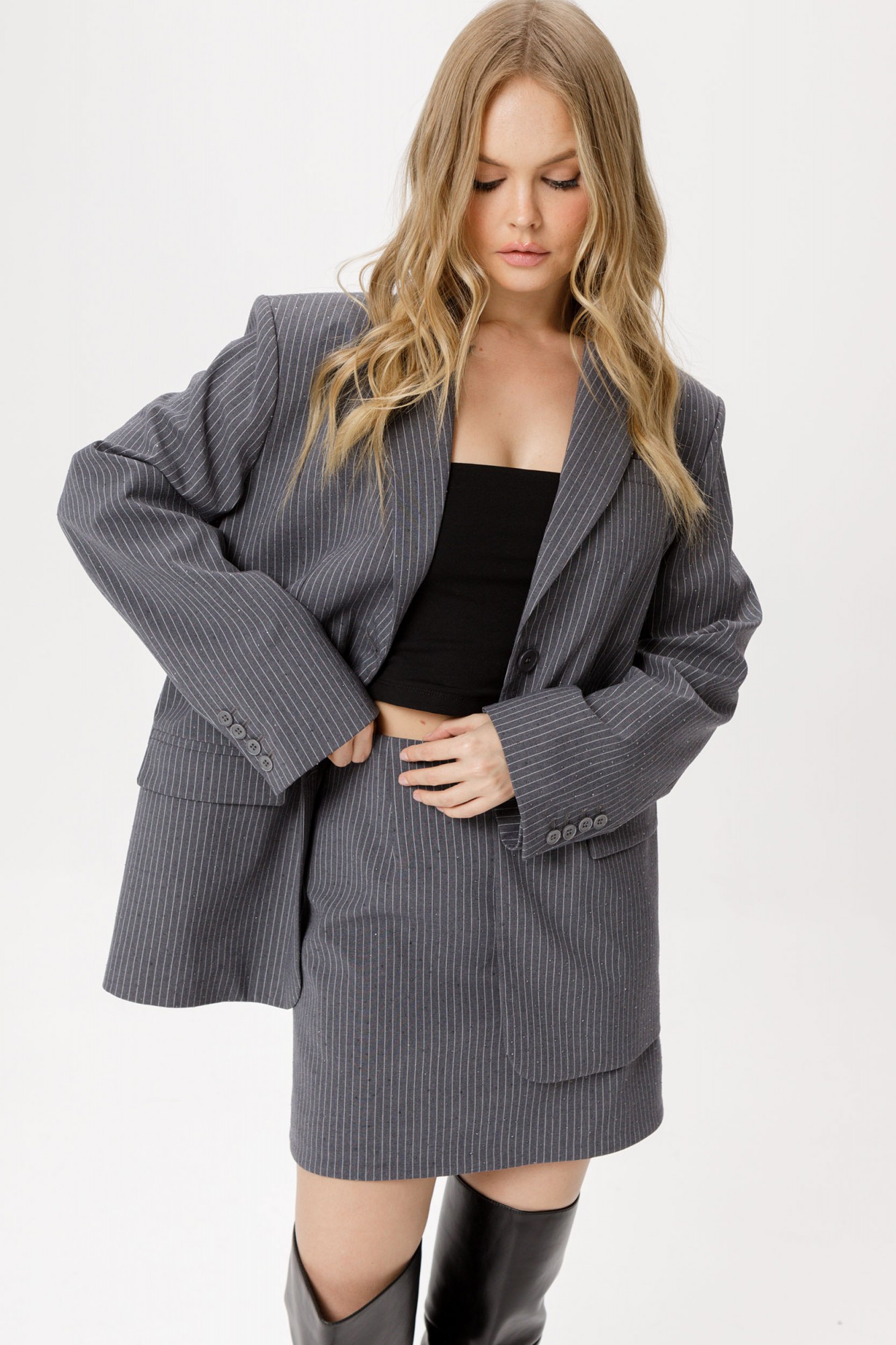 Оверсайз жакет из текстильной ткани в тонкую полоску со стразами. Детали: жакет прямого силуэта, свободный покрой, расширенная линия плеч, пиджачный воротник, перед с прорезными функциональными карманами, однобортная застежка на петли и пуговицы, спинка со средним швом и шлицей, рукава втачные двухшовные, на подкладке.