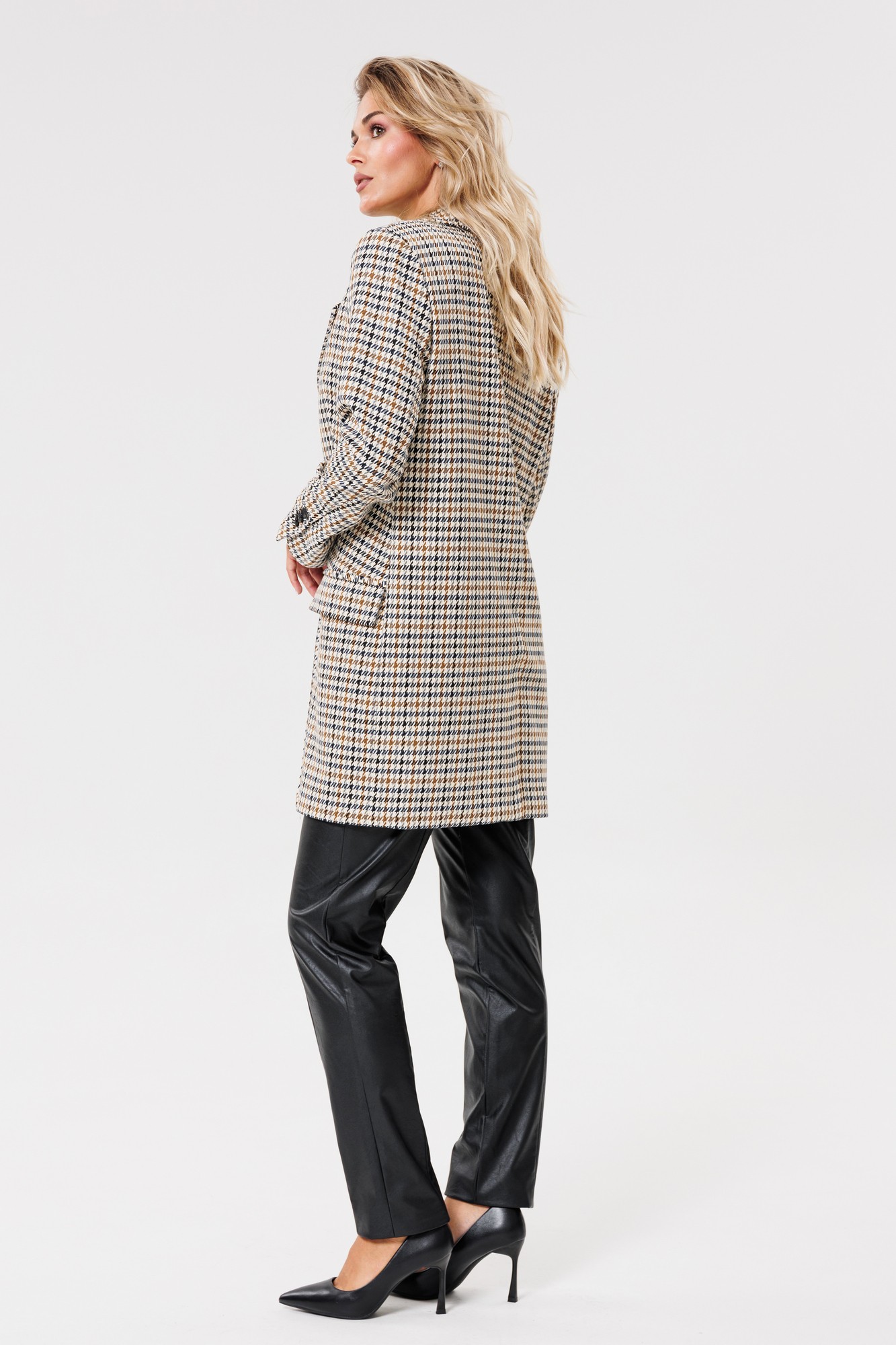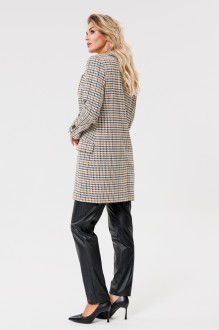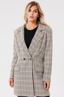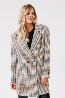 Жакет женский на подкладке из текстильной ткани, двубортный, оверсайз. По переду расположены таллиевые вытачки с прорезными карманами с клапаном. Спинка со средним швом и шлицей. Рукав двухшовный со шлицей на петлях-пуговицах. Застежка жакета двубортная на петлях-пуговицах. Вырез горловины оформлен воротником с лацканами.