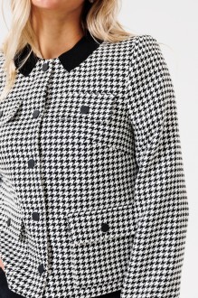 Жакет женский-бомбер на подкладке из текстильной ткани прямого силуэта. По переду расположены нагрудные вытачки, с накладными карманами и клапанами. Рукав прямой одношовный. Низ рукава со сборкой, оформлен манжетой. Вырез горловины оформлен довязом. Застежка жакета на кнопках.