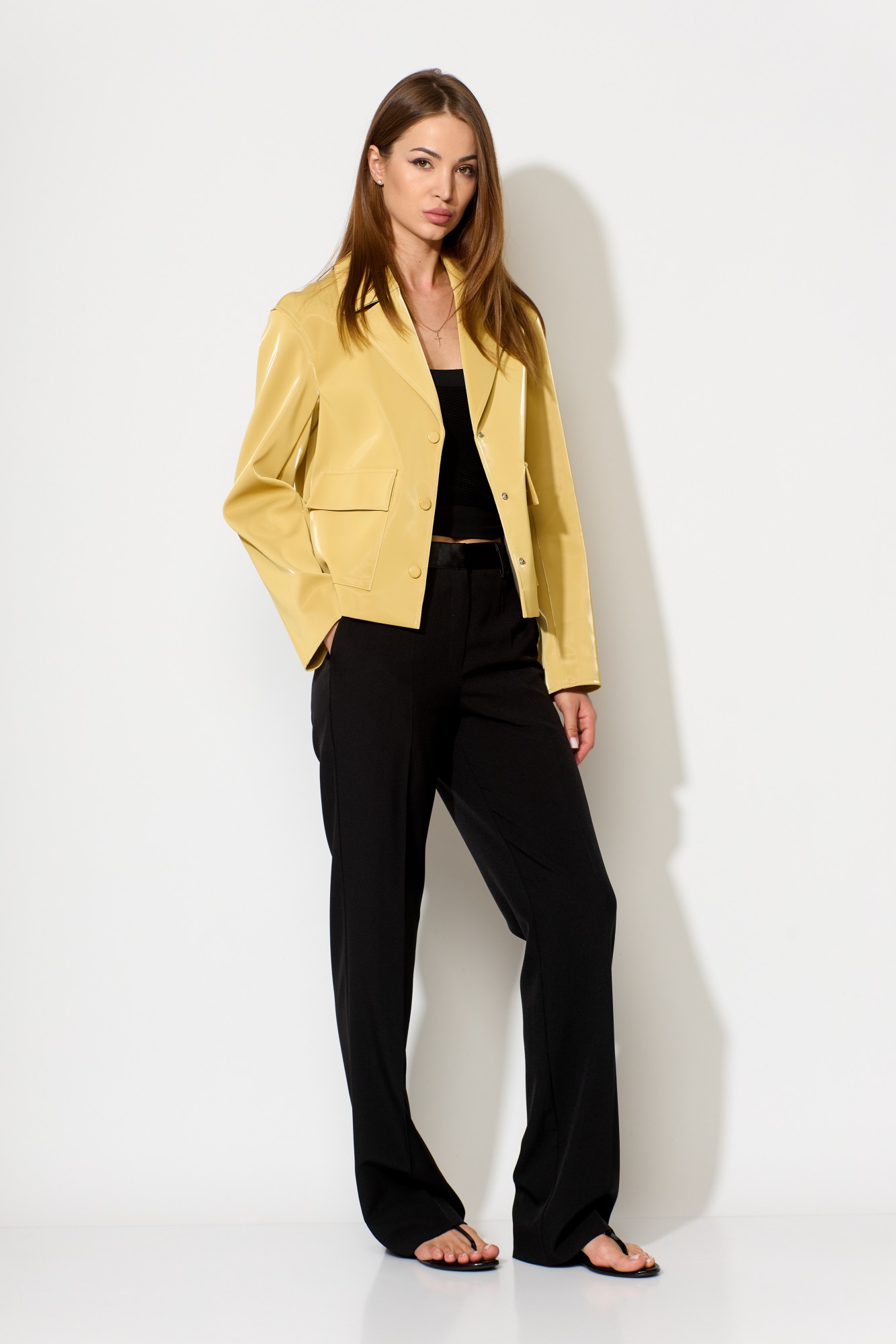 Дизайнерский жакет из лимитированной коллекции, выполнен из стильного материала - лаковой эко-кожи. Жакет прямого кроя, на подкладке. Линия плеча слегка спущена, рукав прямой, двухшовный. Воротник стояче-отложной, по переду функциональные накладные карманы с клапанами. Спинка со средним швом. Стильным декоративным элементом служит контрастная строчка. Застежка на трех кнопках. Трендовый дизайнерский жакет - хит сезона, лаконичный и безупречный, позволит создать множество стильных образов.