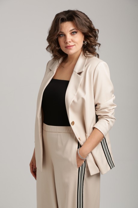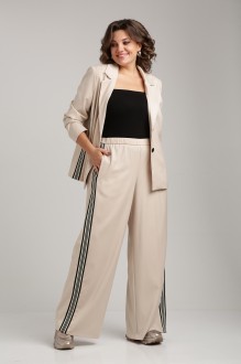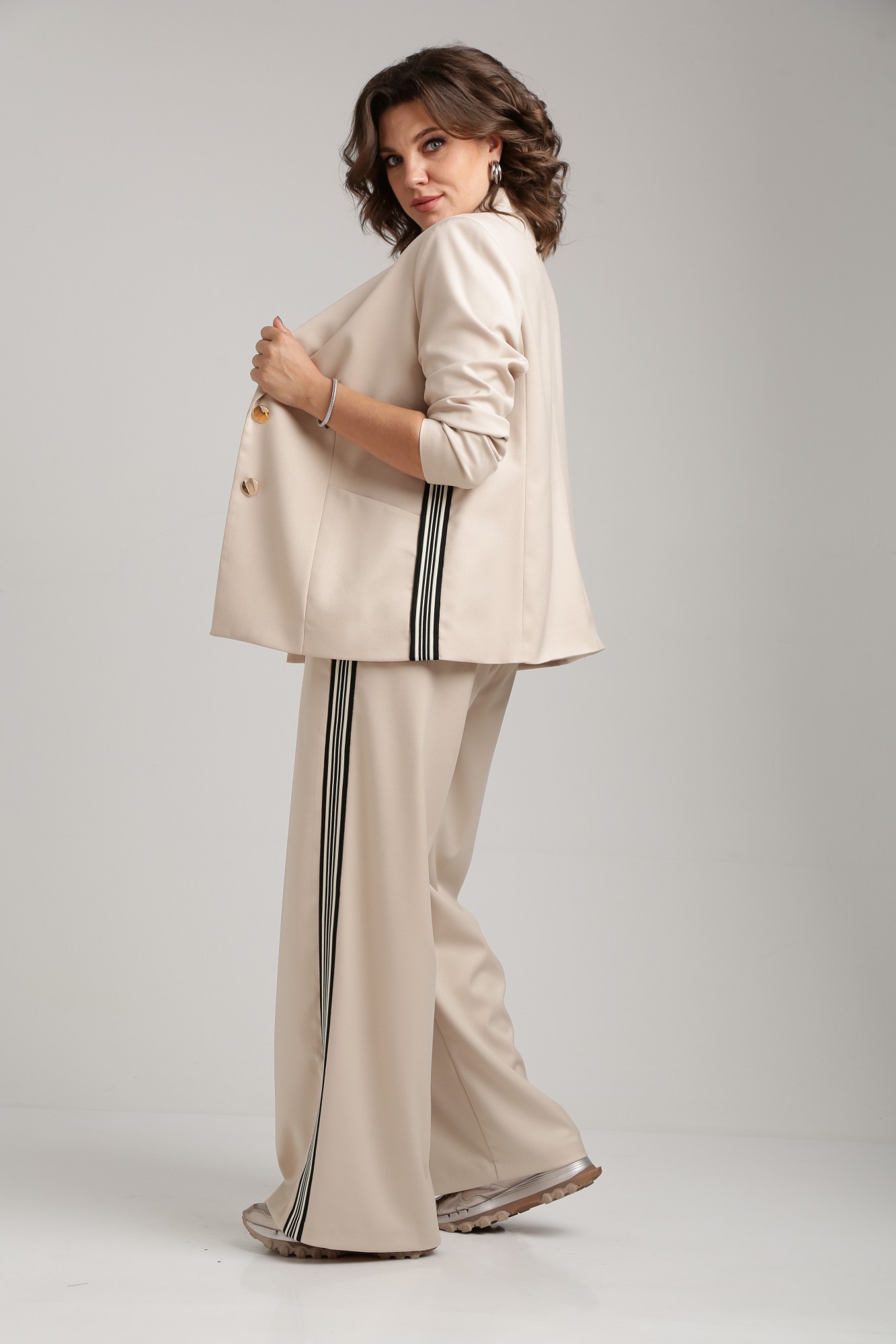 Костюм состоит из жакета и брюк. Жакет из костюмной ткани на подкладке, свободного силуэта, с отложным воротником и лацканами, с центральной бортовой застежкой на петли и пуговицы. Перед с талиевыми вытачками и карманами. Спинка со средним и рельефными швами. Рукав втачной двухшовный. Воротник отложной. Брюки из костюмной ткани свободного силуэта с карманами в боковых швах, на поясе с резинкой. По боковым швам жакета и брюк настрочены лампасы из декоративной тесьмы.