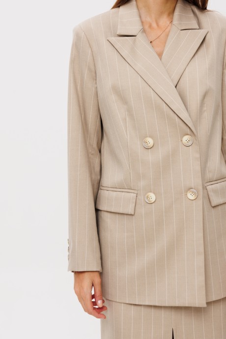 Жакет пошит таким образом, чтобы в нем было комфортно женщине любого возраста, с любыми формами. Жакет двубортный, с нагрудными выточками, прорезные карманы в рамку с клапанами, застежка на петли и пуговицы, спинка со средним швом, втачные двухшовные рукава, с тремя отделочными пуговицами, жакет на подкладке. Выполнен из премиальной ткани костюмной группы.