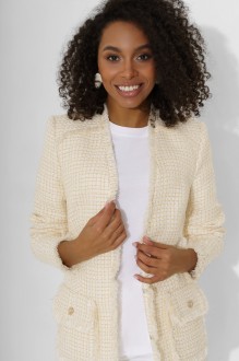 По переду жакет с рельефными швами, выходящими из проймы и талиевыми вытачками, идущими от низа изделия до центра груди. В верхней части переда притачная кокетка с бахромой в шве. В нижней части переда два накладных кармана с клапаном, оформленные бахромой. Карман застегивается на 1 петлю и пуговицу (размер и цвет фурнитуры может незначительно отличаться от фото). Углы клапана и кармана скругленные.