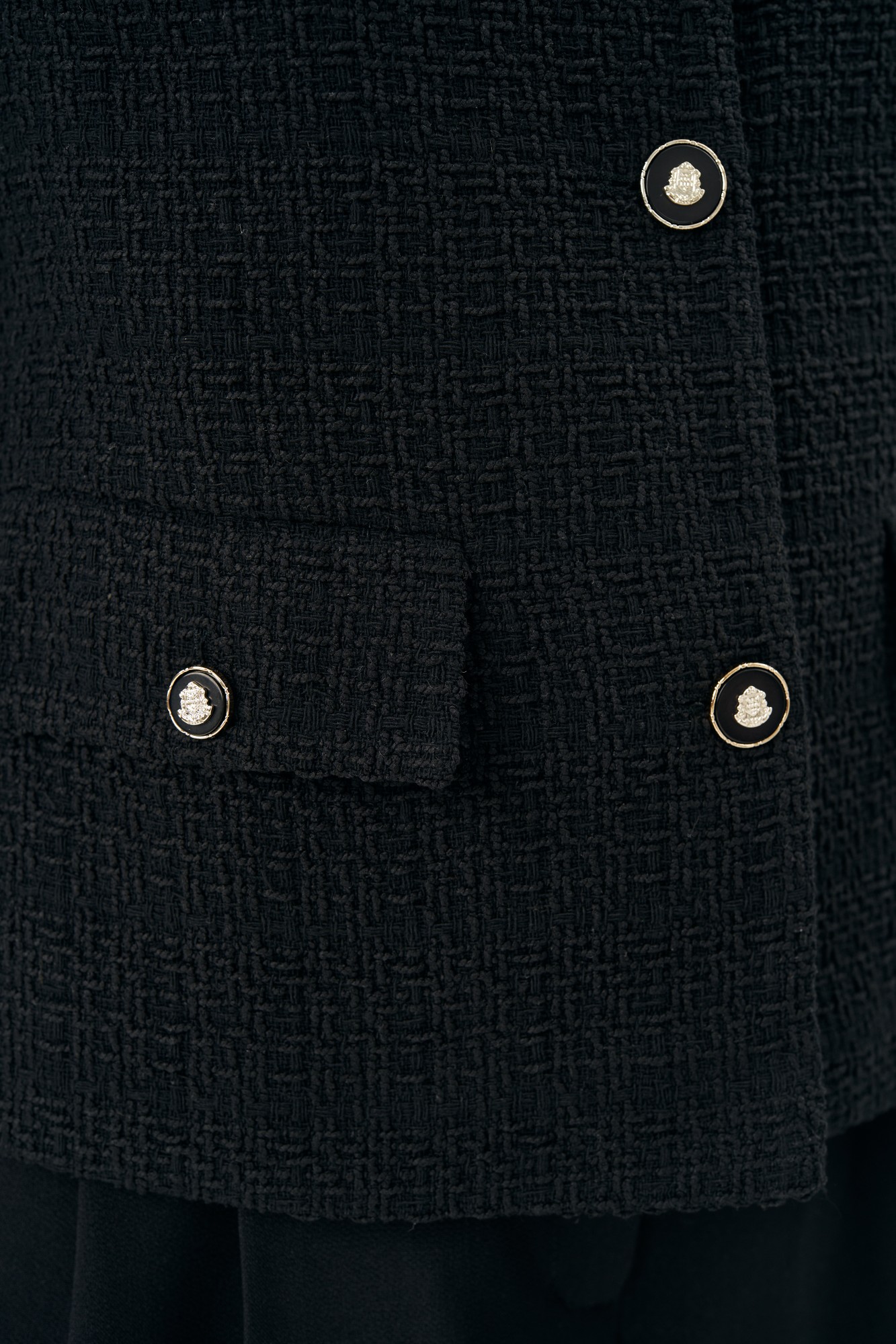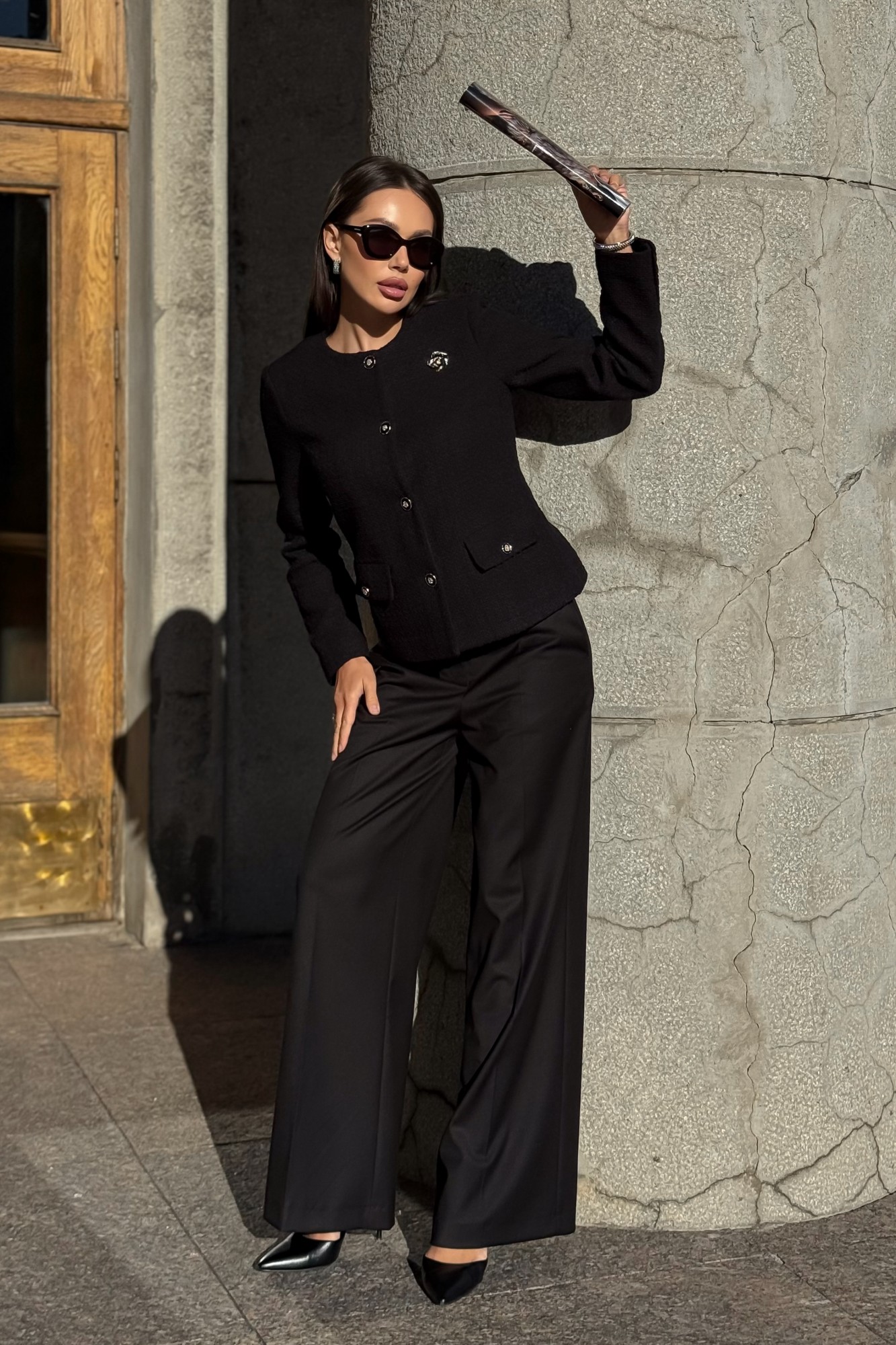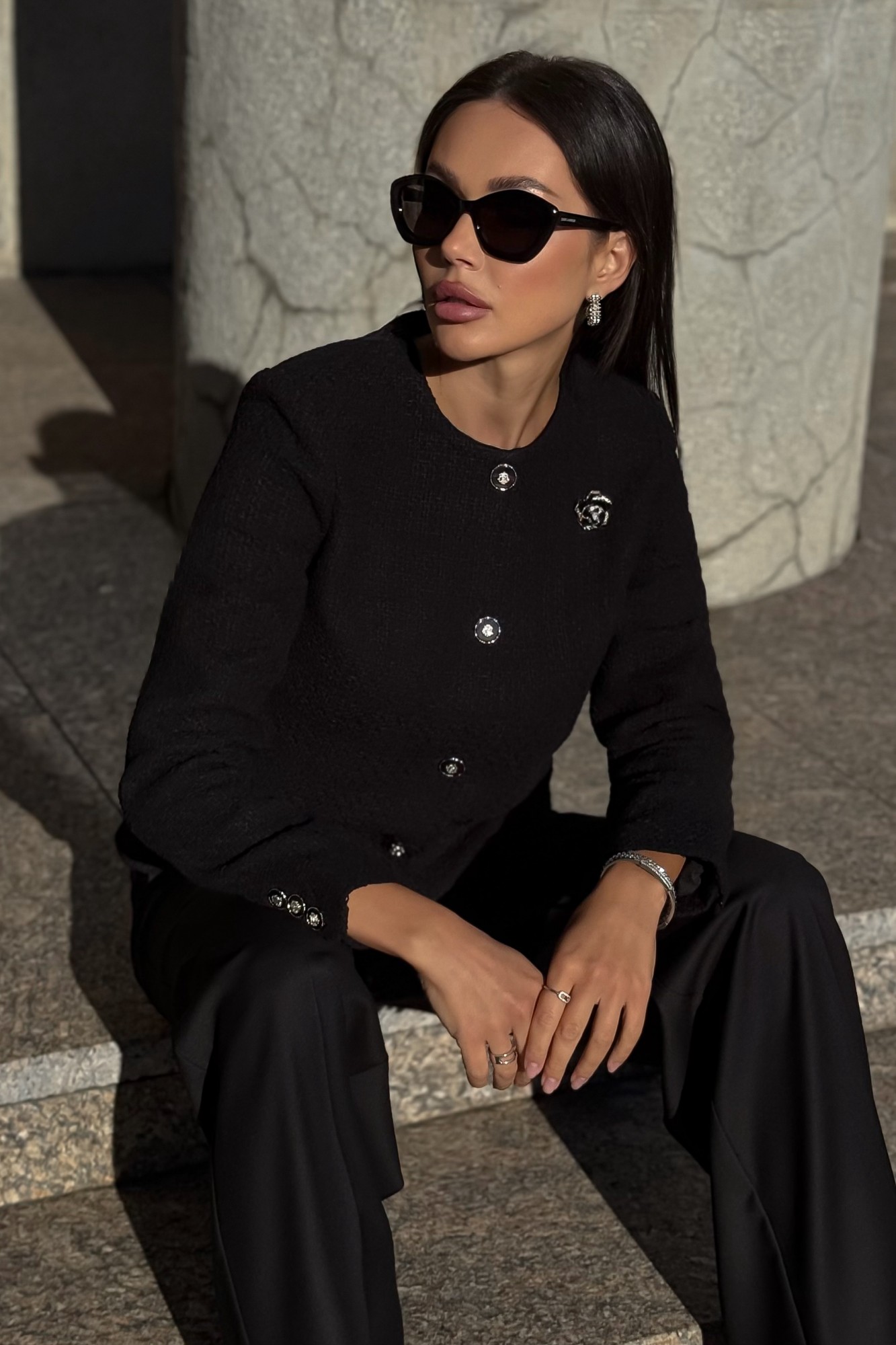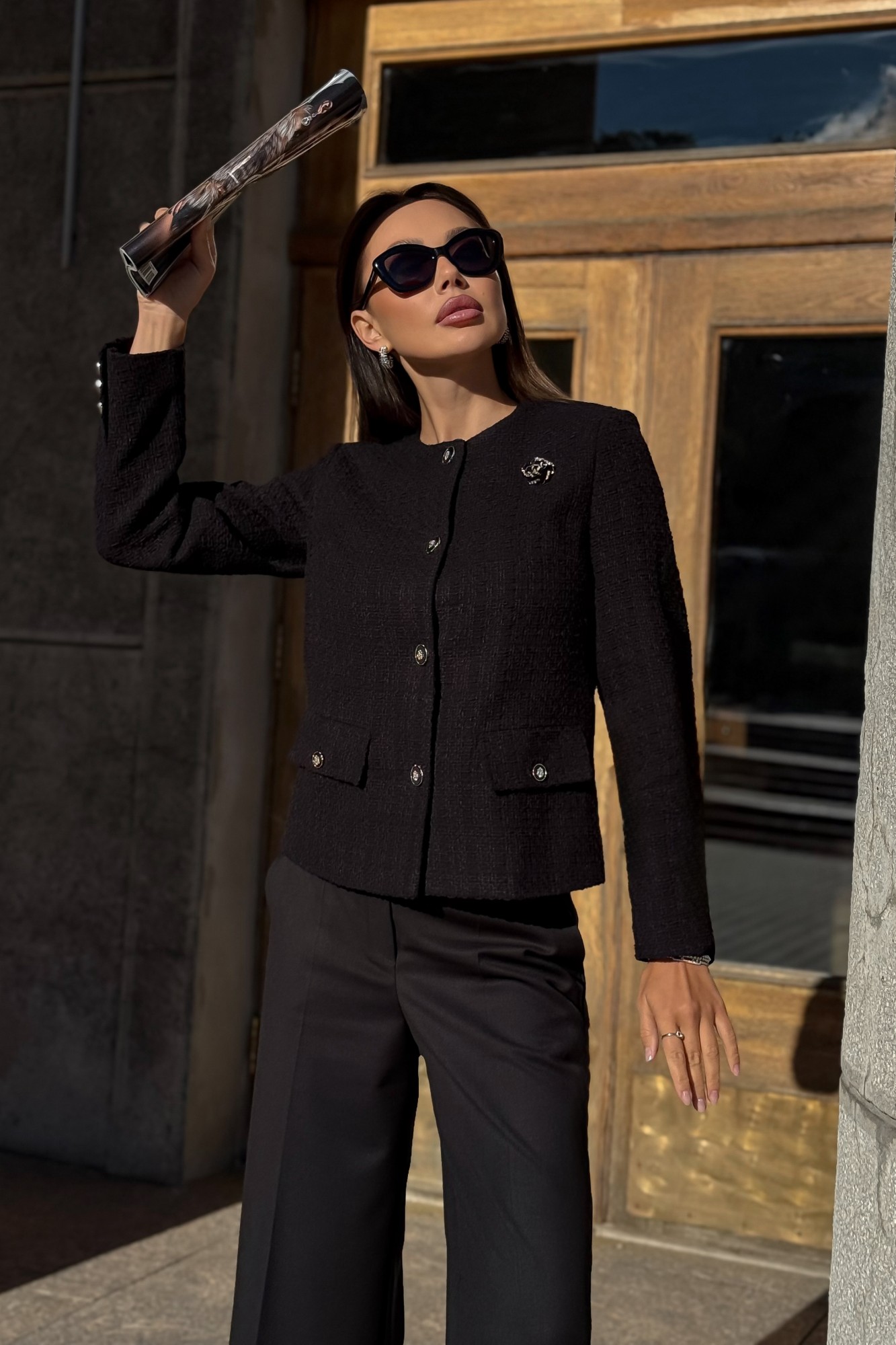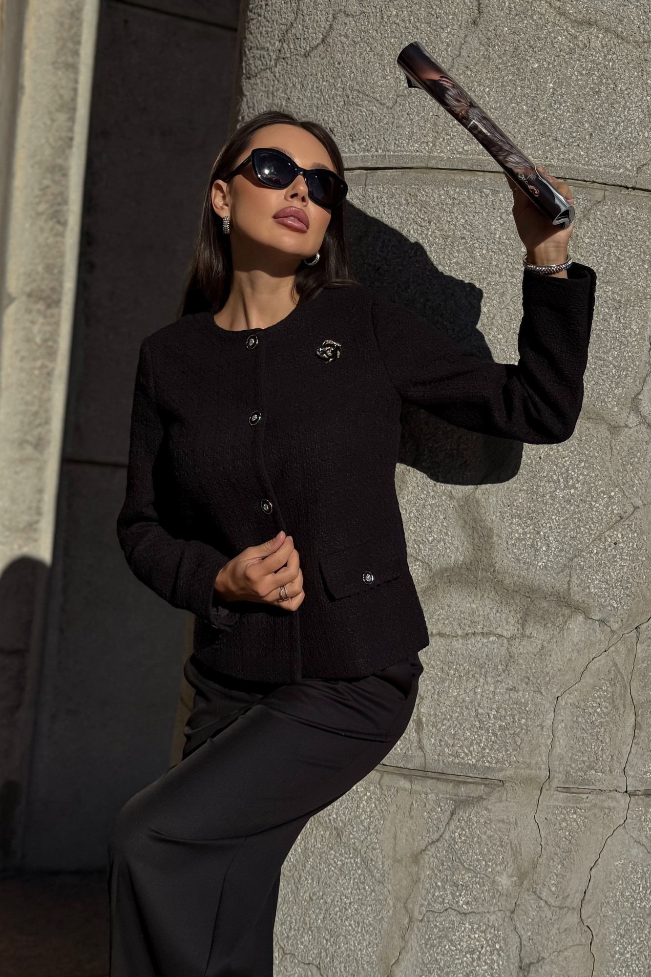 Элегантный твидовый жакет — это универсальная модель, созданная для женщин, которые ценят стиль, качество и комфорт. Классический силуэт, декоративные пуговицы и качественная ткань делают этот жакет актуальным как для офиса, так и для повседневных или вечерних образов. Жакет женский прямого силуэта, выполнен из твидовой ткани, на подкладке, со съемной декоративной брошью, с центральной бортовой застежкой на 4 петли и пуговицы (размер и цвет фурнитуры может незначительно отличаться от фото). Жакет может быть как нарядным, так и повседневным. Перед с нагрудными вытачками, идущими от боковых швов, в нижних частях с прорезными функциональными карманами с клапанами и листочками. Клапан застегивается на 1 петлю и пуговицу. Спинка со средним швом. Рукава втачные, двухшовные, длинные, низ локтевого шва с отлетной шпицей, застегивающейся на 3 петли и пуговицы. Горловина круглой формы, обтачная. Жакет с плечевыми накладками.